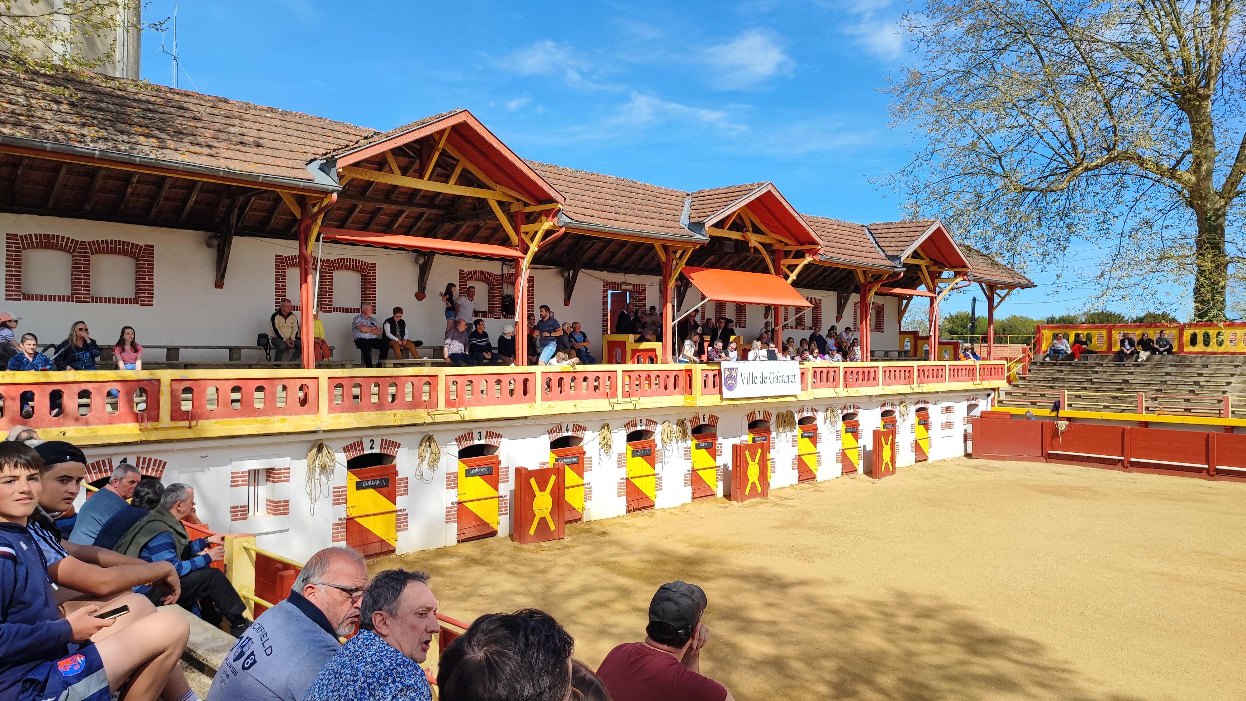 Une très belle Arène dans les Landes, limitrophe au Gers. Du bois au niveau de l'infrastructure et du spectacle sur le sable chaud de Gabarret. Une belle programmation tout au long de la saison, je recommande vivement aux locaux et curistes de passage