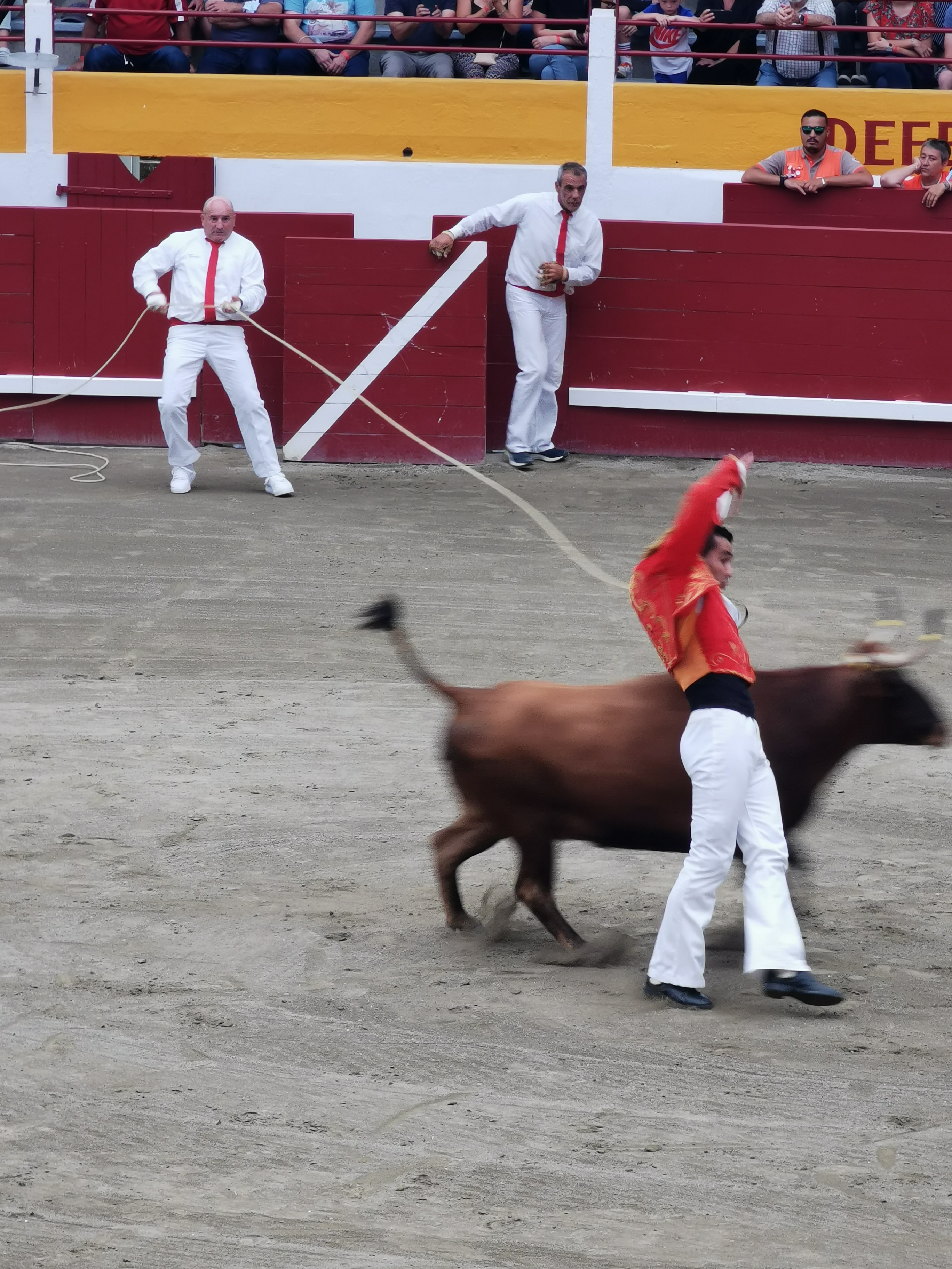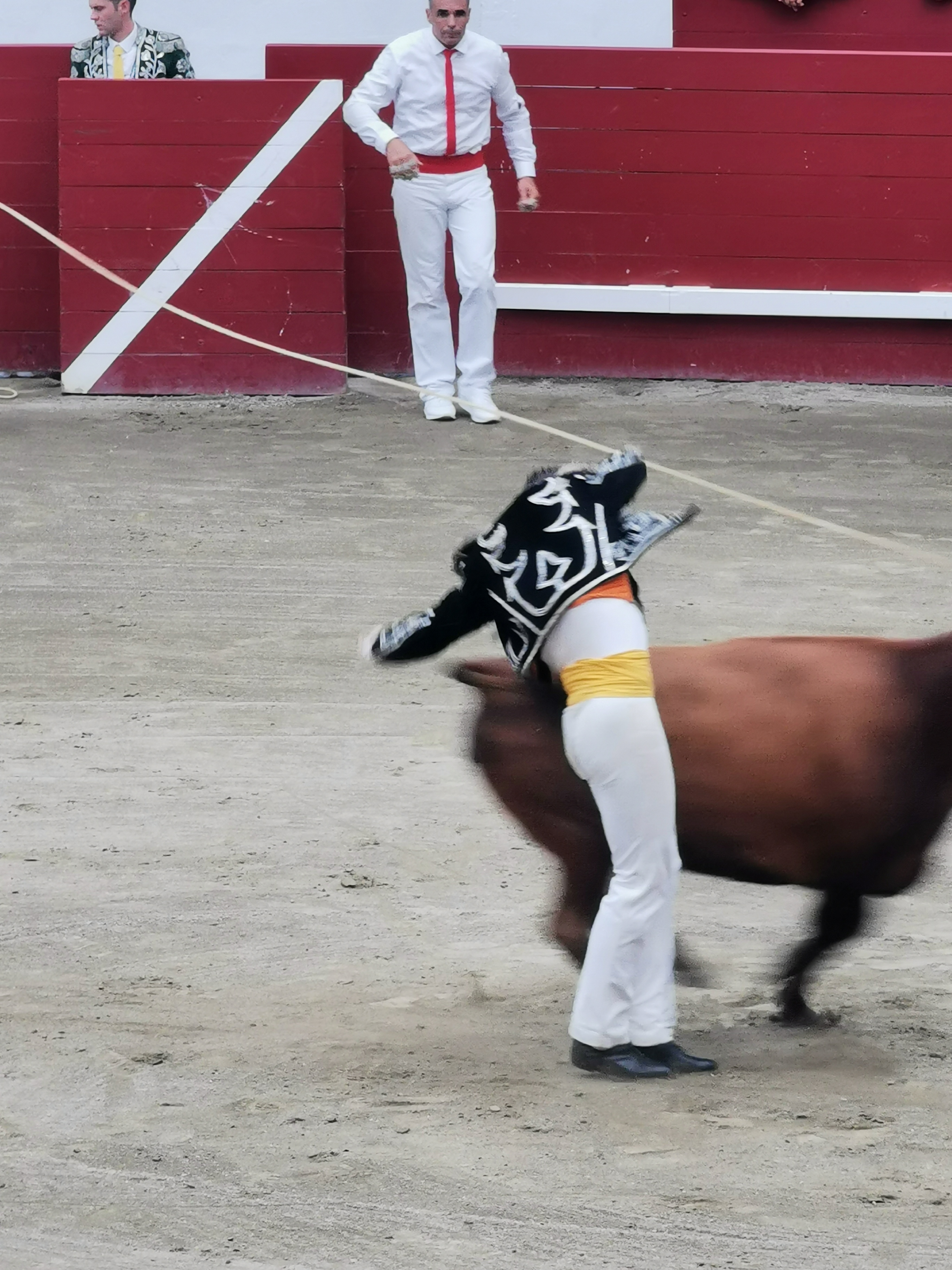 J'avoue que je n'étais pas très chaud pour assister a ce spectacle. Toutefois j'y suis allé et j'avoue que cela m'a énormément plu. Rien à voir avec les corridas, pas de mise à mort 💀, j'ai assisté à un véritable ballet entre l'Homme et la Bête... Le tout accompagné d'une musique joué par une très belle Fanfare... Je joins quelques photos et vidéos, mais le mieux c' est d'y assister car rien ne remplace la ferveur du Public en direct. Tres intéressant belle expérience...